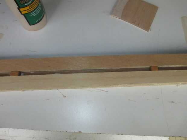 Para mantener esa ranura alineada, usé pequeños bloques de madera recubiertos de vaselina para que no se peguen a la cola. El pegamento que usé isTitebond III. Me gusta este pegamento ya que tiene más tiempo libre que hace más fácil y menos estresante para fijar las láminas. Hay otros pegamentos que funcionarán. Hacer una investigación y encontrar uno que funcione para usted.