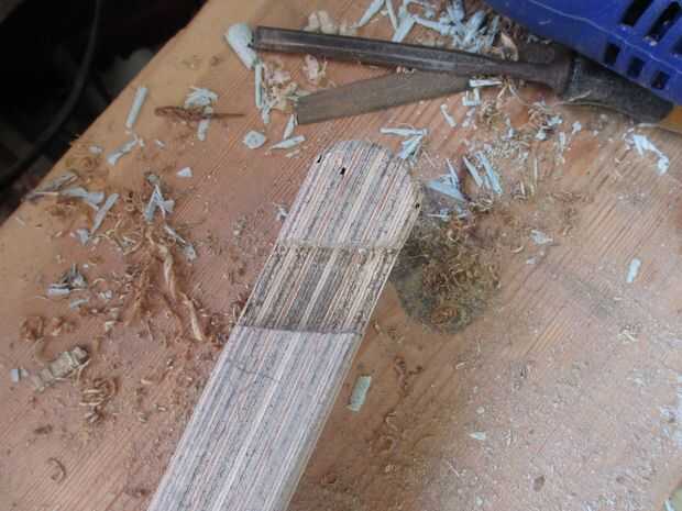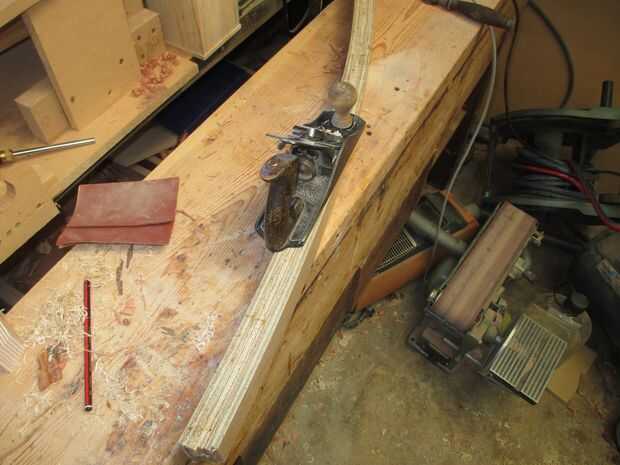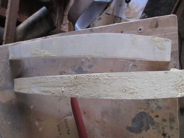 Para poner la ronda el cuerpo que era mucho más cuidado porque el cuerpo es simplemente claro barnizado, así que yo no podía salirse con cualquier chipout con masilla de fijación. Usé un pequeño avión de bloque, spokeshave y papel de lija. La parte inferior del cuerpo se redondea utilizando la lijadora de banda.
