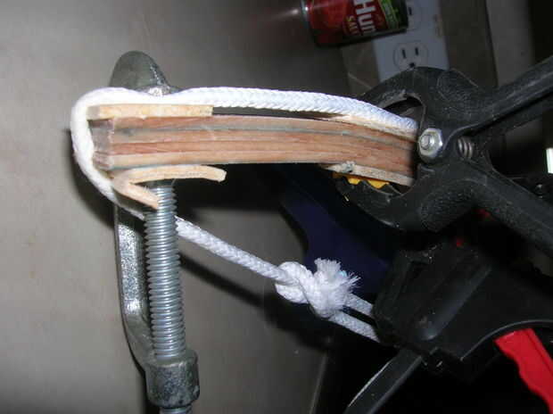 Utilizando algunos pedazos de desecho de madera para proteger las tiras de las mordazas de tornillo, sujete un extremo de las tiras.
