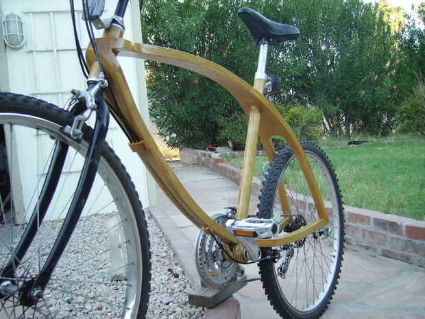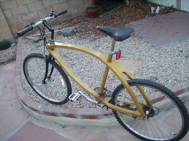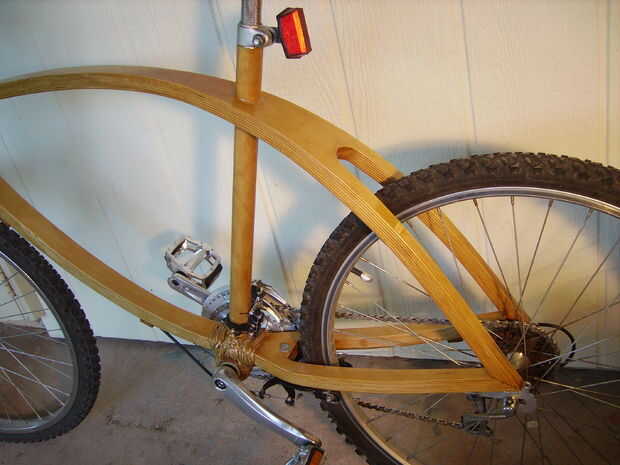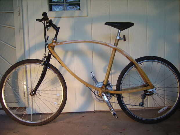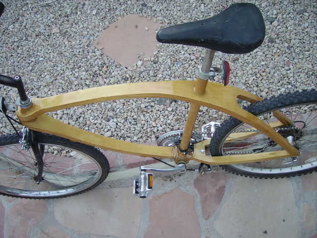 La parte del diseño que me gustó fue que las partes superior e inferior del marco son como resortes separados por el tubo del asiento. Me pareció que tiene un sistema de suspensión integrado en el marco de una idea genial. Idealmente las vibraciones y golpes serían absorbidos en la estructura y devuelto de nuevo a las ruedas, sin hacer el marco demasiado animoso. El marco de que construido consiste en madera contrachapada, fibra de vidrio, epoxy y papel incluso, así que no hay ninguna soldadura requerida.