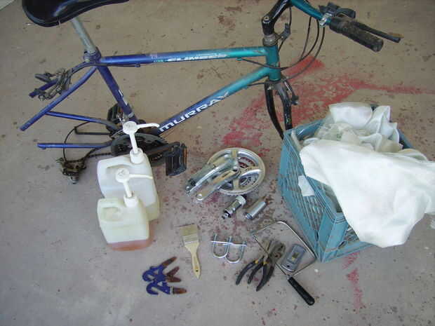 Herramientas: Sierra, lija, escofina, un par de alicates, taladro, lijadora eléctrica, Sierra de vaivén eléctrica, un alambre sólido, cuerda de fibra natural o guita, un tornillo de banco y varios cepillos desechables, tazas y guantes de látex. Cuando sea necesario Asegúrese de usar protección para los ojos y una máscara para mantener la suciedad fuera de los pulmones. También tuve que comprar algunas herramientas de la bici de especialidad, una herramienta de cadena y removedor de brazo de biela.