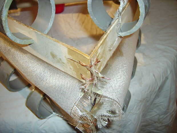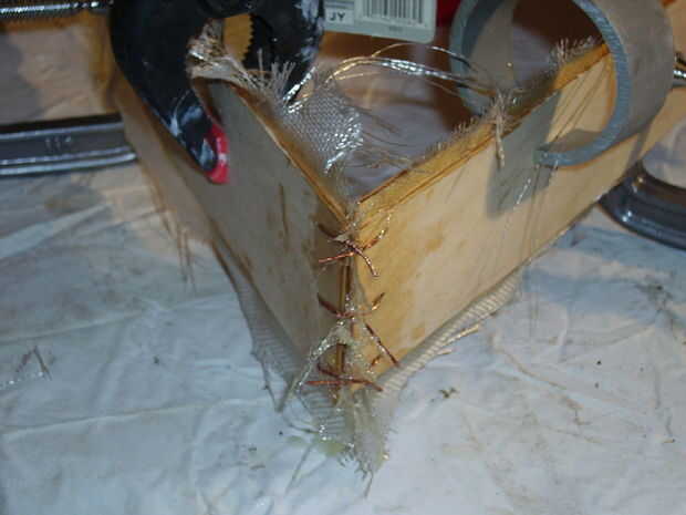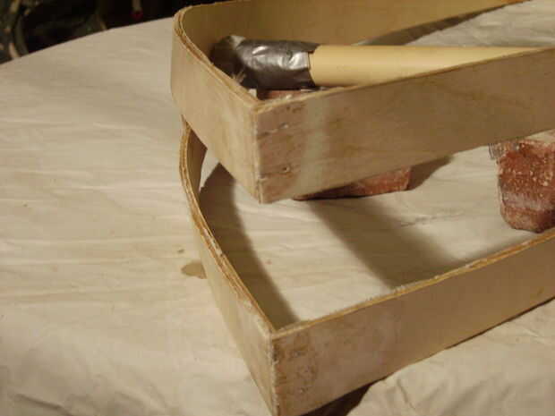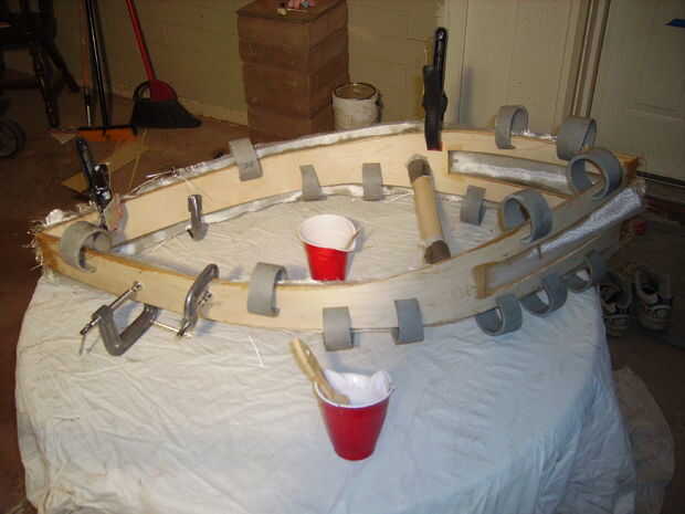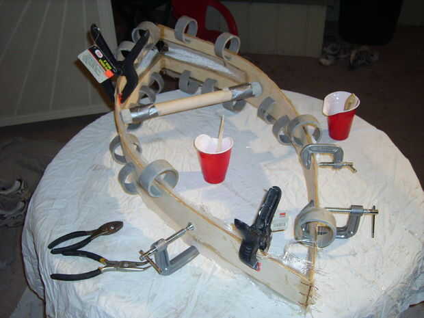 Toma un par intenta conseguirlo doblado en forma y conectarse juntas, pero una vez que el tubo del asiento temporal en el lugar con la madera contrachapada doblada alrededor de él, podía apretar los cables. He intentado hacer un patrón de hueso de arenque donde la madera está conectada junto, pero era solamente moderado acertado. Usé algunas abrazaderas de tipo caseros para mantener los tableros apretados juntos. Después de que curado he quitado los cables y arena hacia fuera.
