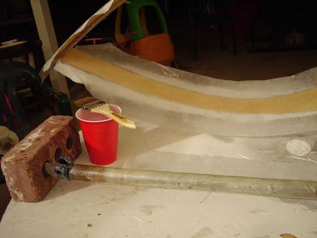 10. agregar otra capa de fibra de vidrio y epoxi seguida por la capa de chapa. La chapa se dobla más fácil una vez que se ha humedecido hacia fuera con epoxi.