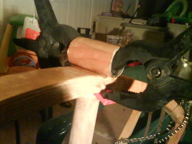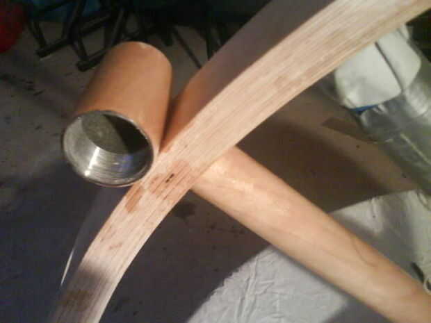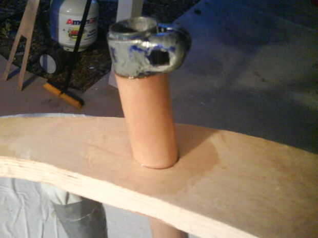 Para determinar donde la caja de pedalier y el asiento del tubo debe ir que sostenía la bicicleta hasta mi bici vieja para tener una idea. Taladré un agujero para el tubo del asiento usando un serrucho de 1 1/4 in. Una vez que el agujero del tubo del asiento, los bordes pueden cortarse dejando 3/4 - 1 pulg. de la estructura a cada lado del tubo del asiento. Luego de la forma cónica la sección superior del tubo hasta 2 de ancho.