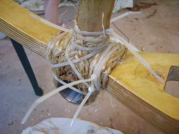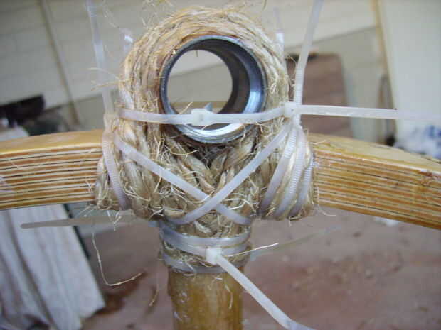 En la tentativa siguiente utilicé tiras de tela de fibra de vidrio envuelta del tubo de asiento sobre el marco para el soporte inferior y la espalda, y luego envuelve toda la zona con muchas cintas de una cuerda de fibra natural que había en la vertiente. Todo estaba mojado con epoxi antes de aplicar. Yo solía lazos de alambre para añadir alguna compresión de las articulaciones, pero en retrospectiva probablemente debo han utilizado algunas cintas de plástico, o eléctrica para deshacerse de las líneas dejadas por las abrazaderas de alambre.