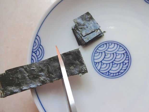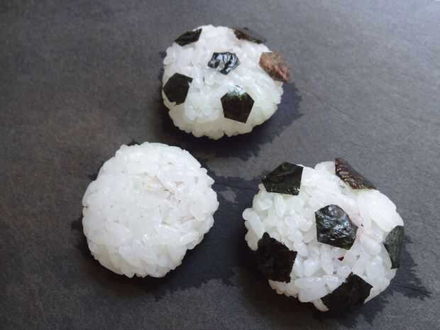 5. Aplique las piezas blackpaper en la superficie de una bola de arroz como parches de fútbol.