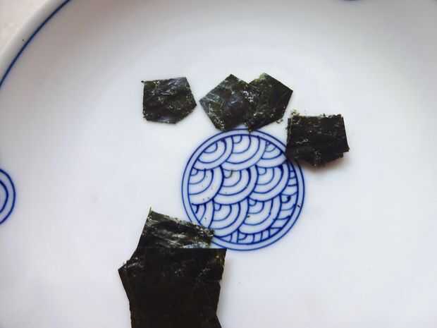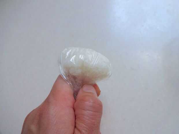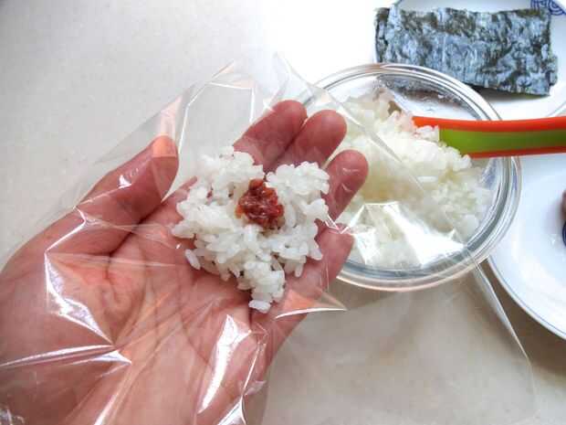 1. poner una hoja de film transparente sobre su palma y poner cierta cantidad de arroz. Como hizo para un niño esta vez, la porción es muy pequeña.