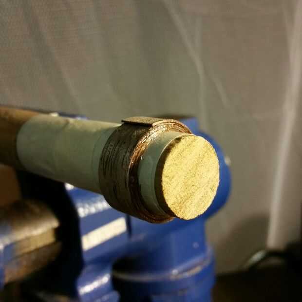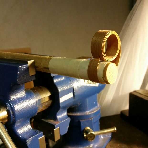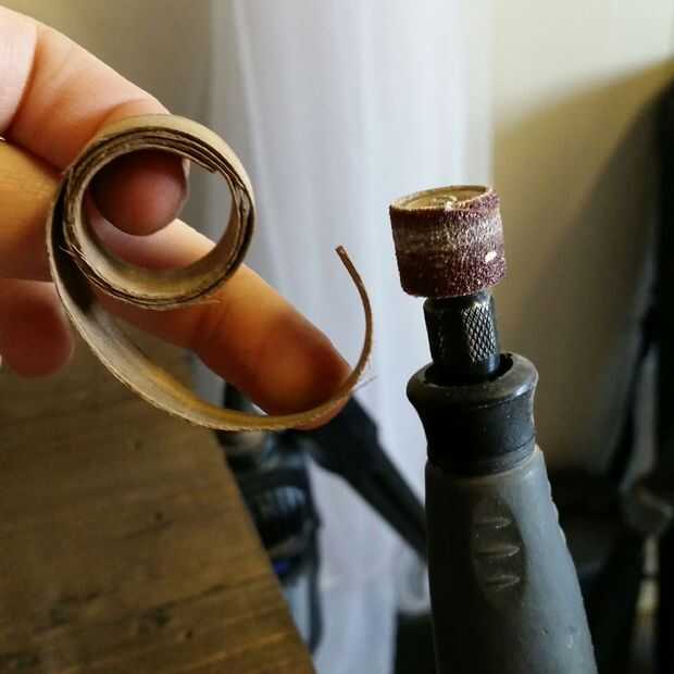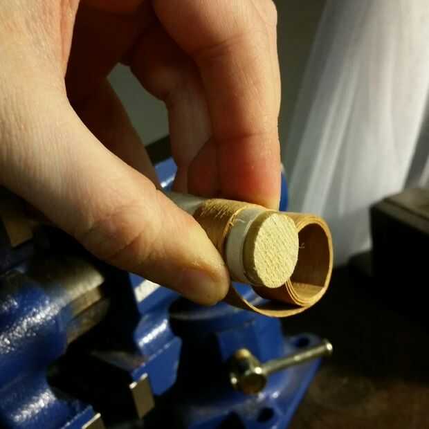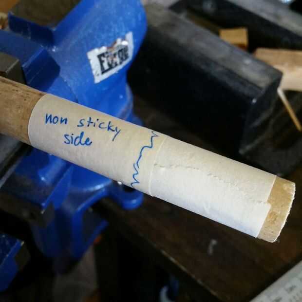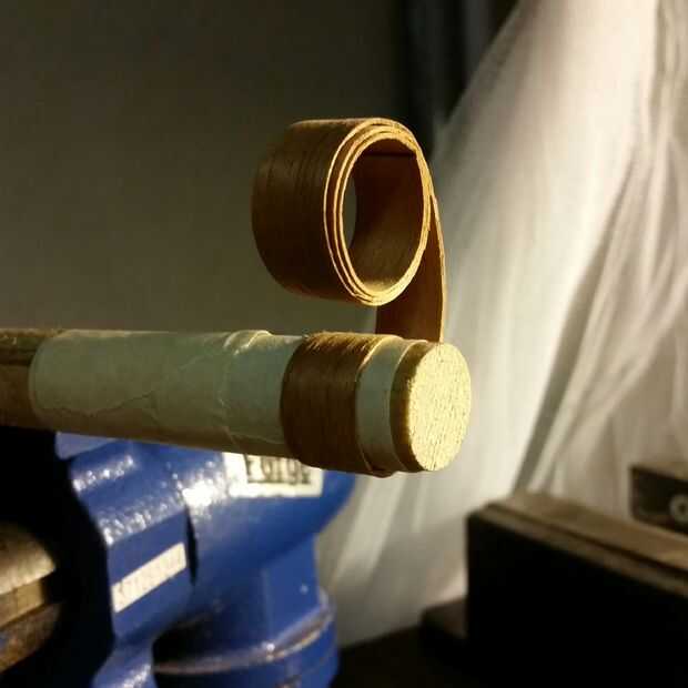 En quinto lugar, pegar el extremo lijado de chapa en la cinta adhesiva y añada una gota de pegamento. Envuelva firmemente una vez la chapa alrededor hasta que encuentra al final otra vez. Presione su dedo en el punto de encuentro para asegurarse de que se seca a unos de otros. * Llanura y sin espacios entre las vueltas es clave para una buena bentwood ring.*