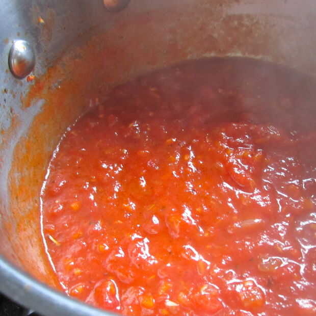 Corte una zanahoria y medio una cebolla con unos ajos y salteados en aceite de oliva hasta suave y agradable. Luego lanzó en algunos pimientos, aderezo italiano y una pizca pequeña teeny de eneldo seco y dejar cocine hasta que el muy fragante. Luego añade la lata de tomate triturado, bajar el calor y dejarlo cocer a fuego lento mientras que todo lo demás hice. :)