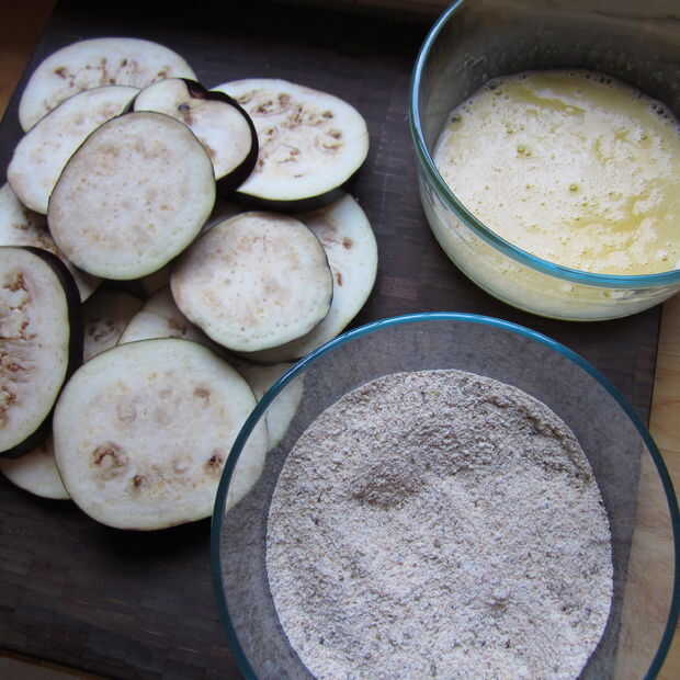 Lo que usted necesita.3-4 huevosAceite de olivaQueso Mozzarella ralladoSalsa de tomate2 berenjenasAjoMigas de panPaso 1:Cortar la berenjena en rodajas como se muestra en la imagen.Paso 2:Poner el huevo en un cuenco y el pan rallado en un plato grande