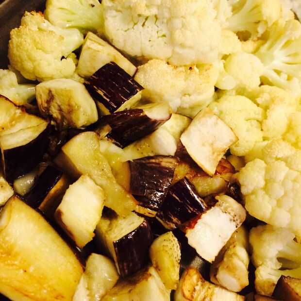Coloque la berenjena y coliflor en una bandeja para hornear ligeramente engrasada. Hornee a 450 durante unos 20 minutos hasta que la berenjena es suave y la coliflor marrón