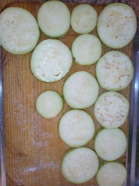 No preocuparse por el exceso de sal, esto es para las berenjenas pierdan un poco de agua, por eso es conveniente hacerlo en la pica de la cocina o poner un trapo debajo de la tabla.