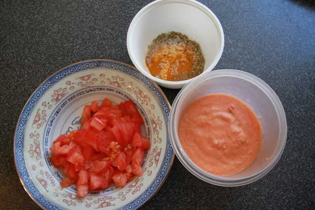 Cortar una cruz en la parte inferior de los tomates y dejar durante 30 segundos en un recipiente con agua hirviendo. Pelar y picar.