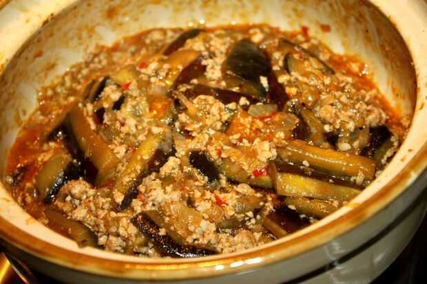 Calentar el aceite en la olla de barro (o el pan); cuidado con el calor bajo la olla de barro, no gire demasiado alta de lo contrario podría agrietarse tu olla. Freír la cebolla, el ajo y el jengibre en el aceite y luego añadir la carne adobada. Freír hasta que doren.