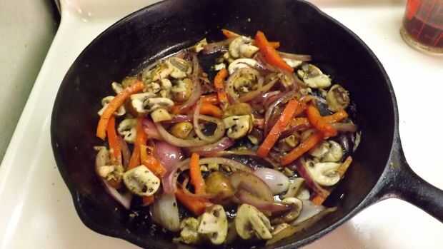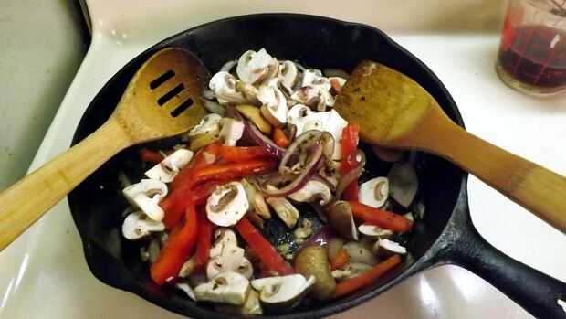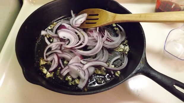- Añadir la cebolla, pimiento y champiñones; aumentar el calor a medio y cocine, revolviendo frecuentemente, hasta que la cebolla ablande (unos 3 o 4 minutos).