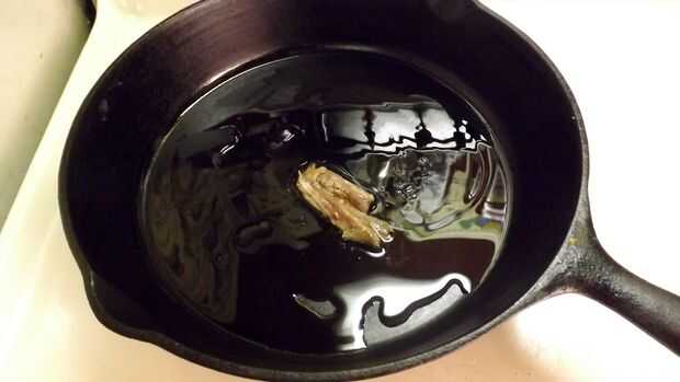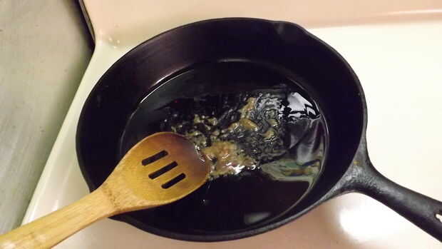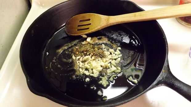 Lugar 2 cucharadas de AOVE en una antiadherente cacerola o hierro fundido sartén (mi preferencia) y Caliéntalo a fuego medio-bajo.