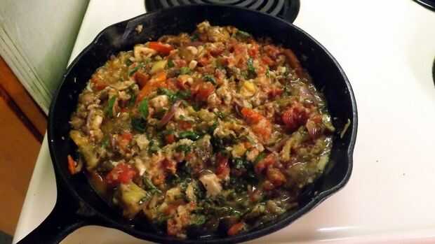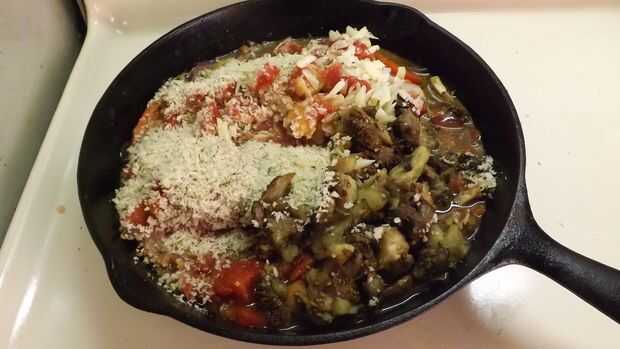 - Agregar el vino. Agregue las almejas picadas (con líquido), queso Gruyere, pan rallado y berenjena picada; Revuelva para mezclar, luego añadir la albahaca picada y 1/2 de los tomates en dados (reserva la otra mitad a verter sobre las berenjenas rellenas). Cocine hasta que caliente.
