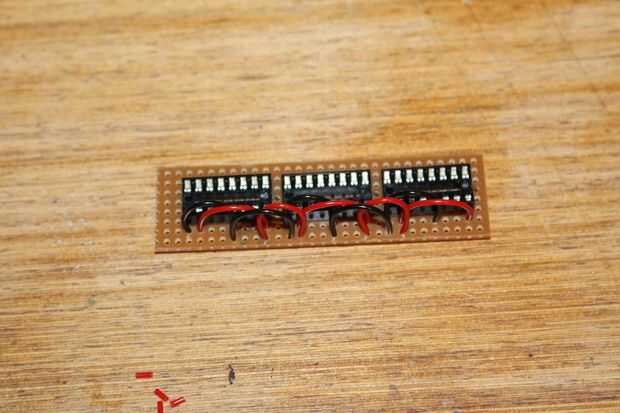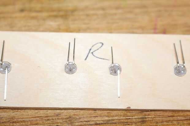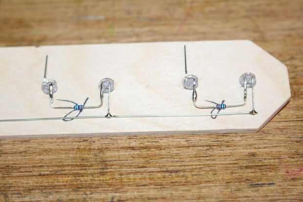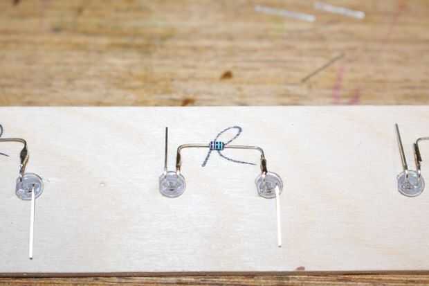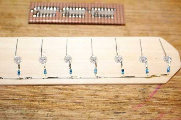 Decidí montar las resistencias requiere de LED en la pierna de tierra de los solteros y entre los dos LED donde se montan en dos. Esto da 4 valores de resistencia diferentes para dar el brillo necesario.