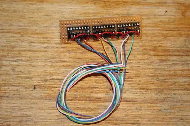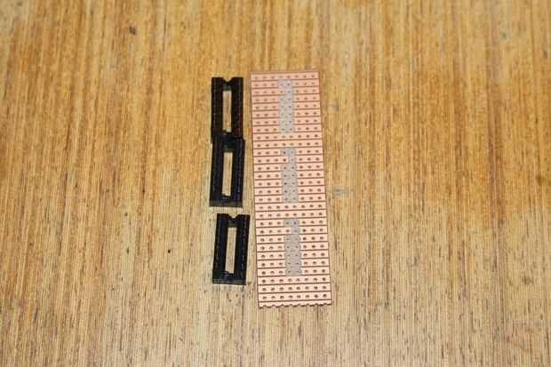 Para los circuitos estoy usando "tablero de vero" un poco es necesario para el cambio 3 registros y otro poco es necesario para los 5 botones. Cuando estaba pensando en el diseño de la Junta de cambio decidí que sería mejor traer salida de Q0 a la izquierda a unirse a las otras 7 salidas y también deshacerse del pin 9 (Q7 "salida serial) para permitir que el suelo para tomar su lugar, lo hice quitando el perno del soporte del chip , este entonces deja un diseño limpio agradable con todas las salidas a un lado (con el suelo) y las entradas en el otro lado. (Ver fotos para más información)