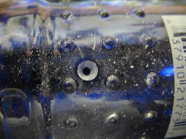 Después de colocar la botella en el vicio con el logo de abajo está listo para perforar. Este agujero será más adelante una entrada para los cables de suministro de energía. Inicie la perforación justo encima de la base, evitar que la broca