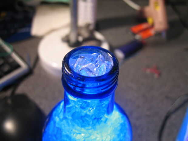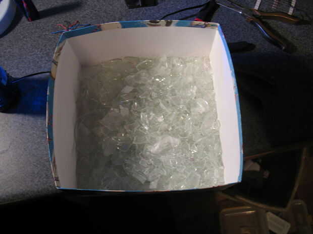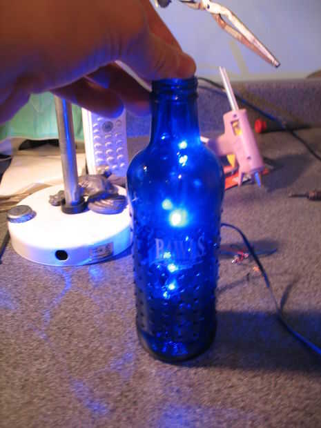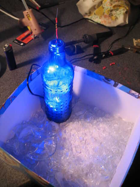Con el fin de dispersar un poco la luz y evitar ver directamente los LEDs decidí añadir fragmentos de vidrio. Llenar la botella con estos hace un gran trabajo en ocultar todos los cables y que la botella se ven muy bien con el LED.