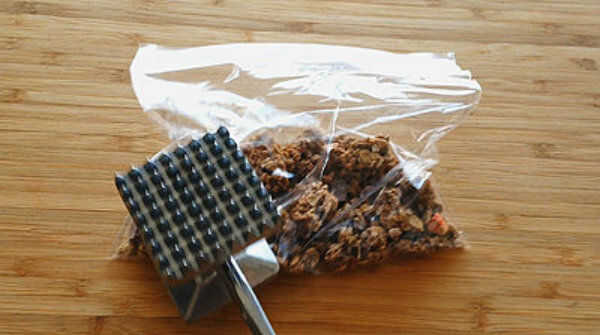 Lo primero es lo primero, añade una 1/2 taza de Granola, dentro de una bolsa de sandwich y triture. No tienes que triture finamente pero por lo menos intentar conseguirlos cerca :) Una vez termines, [ reservar ]
