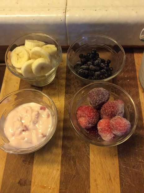 algo delicioso por la mañana que no sea demasiado pesada.Paso 1: ingredientes: 1 taza de yogur1/2 taza congelada mixtas bayas (arándanos, moras y frambuesas)1/4 de taza de jugo de fruta de su elección1 1/2 o 2 barras de granola1 plátanoPaso 2: Medir