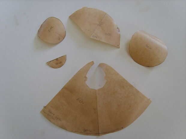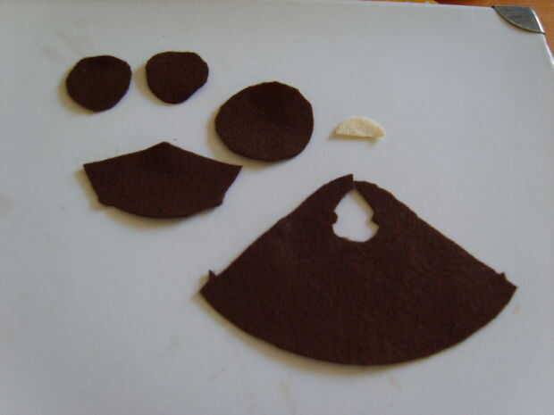 En primer lugar un patrón debe hacerse usando el papel para hornear. Esto consiste en maily de 2 círculos de semi, el más grande que el cuerpo y el uno más pequeño que la cabeza. Tiene que haber un recorte en el pedazo de cuerpo para permitir que la cabeza para ser cosido en. También hay un círculo completo de la base, la circunferencia que es igual a la longitud del borde curvado largo de la pieza de cuerpo. También hay 2 formas de huevo para los oídos y un muy pequeño semicírculo de una nariz.
