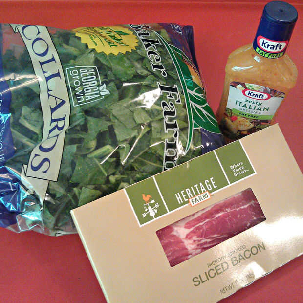 Compre una botella de su aderezo favorito italiano. Me gusta la variedad libre grasa baja en calorías para reducir las calorías. No te preocupes demasiado el tocino y las calorías. Un bote grande de verdes hará que al menos seis grandes porciones, cada porción tendrá aproximadamente una rebanada de tocino, 50-100 calorías.