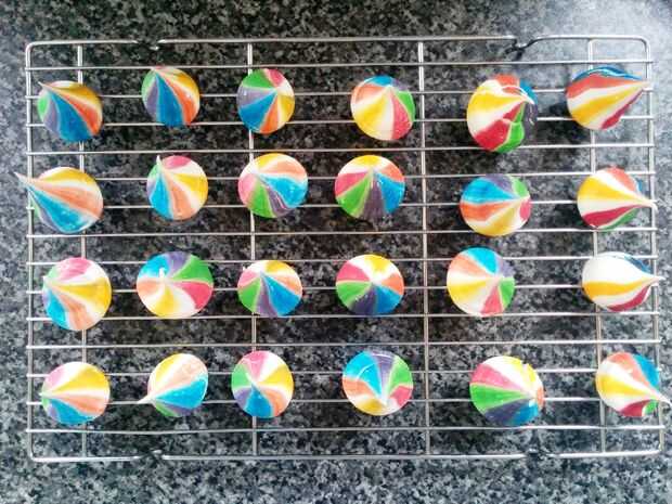 publicado originalmente en: http://www.mommyknows.com/how-to-rainbow-cupcakes-in-a-jarPaso 1: Lo que necesitará Precalentar el horno a 350fLo que necesitarás:mezcla para pastel blanco en caja 11 lata de glaseado blancovariedad de colores de glaseado