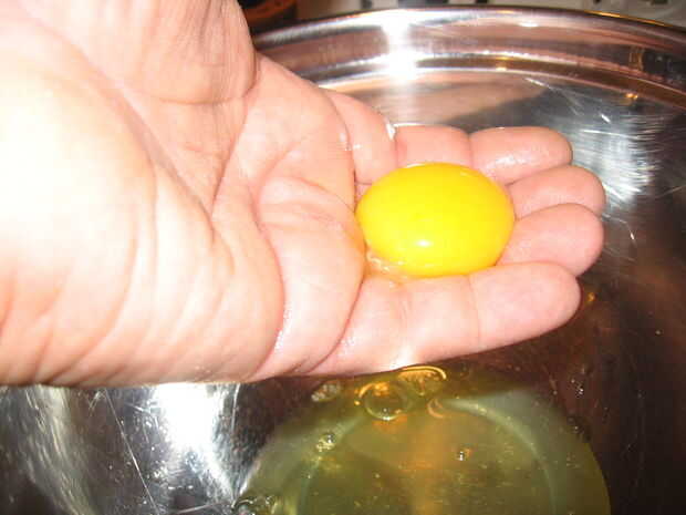 Para separar las claras, simplemente romper el huevo en la mano y permitir que los blancos se deslice a través de los dedos en el recipiente. Tome su tiempo-si que consigues alguna yema de huevo mezclado con las claras, usted tendrá que comenzar de nuevo.