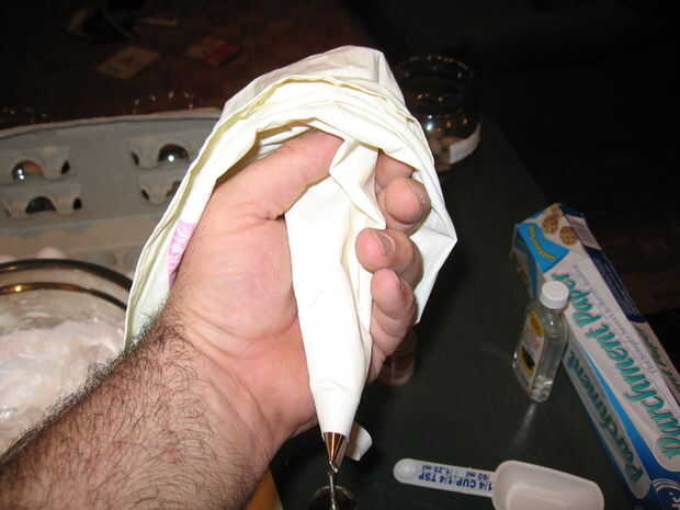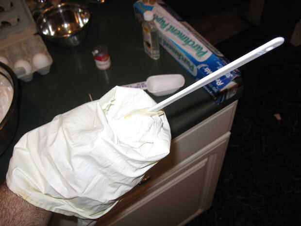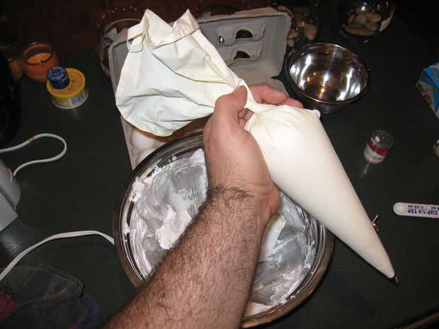 Su gran Manga pastelera, y cualquier sugerencia que te hace feliz, preparar para el merengue en la bandeja para hornear. La mejor manera que sé describirlo es bajar la Manga pastelera en la mano, luego "hacer un cono de helado" por el merengue sobre el puño de embalaje (ver fotos). Una vez que tenga suficiente relleno en la bolsa, tire la bolsa hacia arriba sobre tu mano y giro. Tendrás un poco de aire en la bolsa. Dar un buen apretón en el bol para sacar las burbujas. Ahora estás listo para el merengue en la bandeja para hornear.