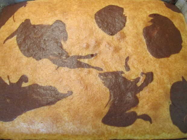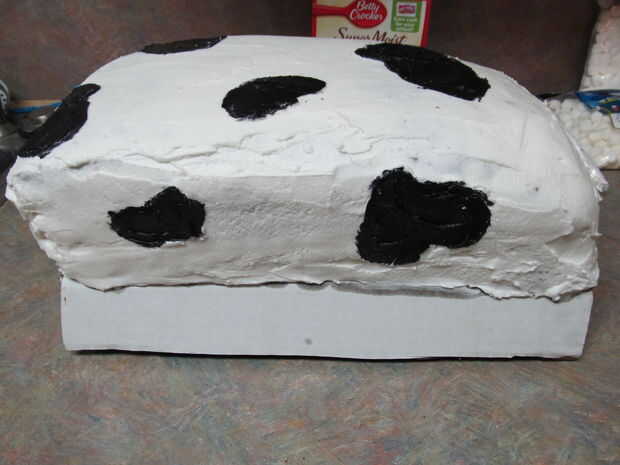 LA torta = BESSY cuerpo está compuesto enteramente de pastel. Antes de empezar a hornear sin embargo, primero tendrá que construir una plataforma para la torta. La plataforma será apoyar la torta así como ocultar su soporte de la torta y extremos de la botella. Hice un plano de cartón simple usando el tablero de la torta (o una cartulina encerada) que encajan en la parte superior del soporte sin embargo, podría ser quitado fácilmente. Ahora usted puede hornear 3-4 "vaca impresión" pasteles 13 X 9. Necesario dependerá de la cantidad de pastel en el tamaño se hizo su plataforma, porque desea que su pastel para quedar al ras con los bordes de plataforma y unas 3 capas de alta. Una vez que sus tortas son enfriados antes de armarlas como lo haría cualquier simple torta de 3 capas. (nivelado y con escarcha entre capas) Finalmente el exterior de su torta con alguna crema de manteca blanca de escarcha y añadir algunos parches negros con colorante alimenticio. EASY PEASY!