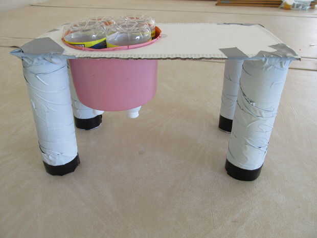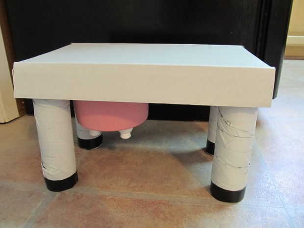 EL STAND = el soporte se mantenga la bolsa de leche y apoyar la torta. Para hacer el soporte tomé una longitud de cartón resistente y cortar un agujero suficientemente grande para contener la bolsa de leche. Luego agregar 4 tarros de cristal grandes para piernas. (Reciclé algunos tarros de vela) Envuelve los tarros en cinta blanca con un trozo de cinta negra en la parte inferior para asemejarse a la pezuña. Entonces graba los tarros firmemente a la parte inferior de la cartulina con la cinta blanca. Una vez que se terminó el soporte, he probado el ajuste de la bolsa de leche en ella. El borde del contenedor debe quedar al ras con la cartulina.