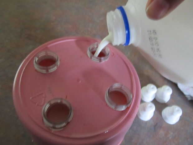 LA bolsa de leche = reuní una bolsa de leche funcional con 4 botellas de tapa pull pequeño y un recipiente de tamaño de cool whip (mina era en realidad una cubeta espeluznante McDonalds). Yo primero aerosol pintado el envase rosa, luego 4 perforados agujeros en la parte inferior espaciados. Luego empujé las botellas vacías para arriba a través de los agujeros. Llena con la leche y atornillados en las tapas de continuación, almacena en la nevera hasta la hora de montar todo.