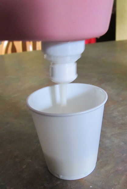Nota: A leche BESSY tire hacia abajo en una de las tapas para abrirlo. Sólo funciona con una tapa abierta hasta que la botella está vacía. Colocar la taza debajo de la cápsula abierta y apretón suave en la parte superior de la bolsa. La leche será empujada hacia fuera en la taza. Puede dejar la tapa del mismo abierta (no escapará a menos que siendo exprimido) hasta que esté listo para vaciar la siguiente. Si bolsa de BESSY se vacía antes de que todos los invitados han tenido su terraplén, puede levantar la torta en el stand, retire la bolsa, rellene las botellas como antes y volver a montar para más entretenimiento.
