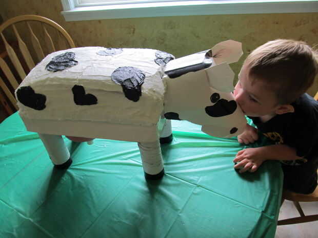 LAS decoraciones de papel = soy trata de mantener las cosas simples y ya que la torta sí mismo es bastante grande (sobrecarga de azúcar), opté por un poster board vaca cabeza y cola. Arrojó con cartulina blanca y cinta adhesiva negra. Entonces solía marcadores de color los ojos y la nariz. Hice un 3D en forma de cabeza pero si no eres del tipo"artsy" simplemente podía imprimir una cabeza tridimensional 2 si lo desea. Grabado 2 pajitas de plástico duros en el interior de la cabeza para unir la cabeza del pastel más tarde.