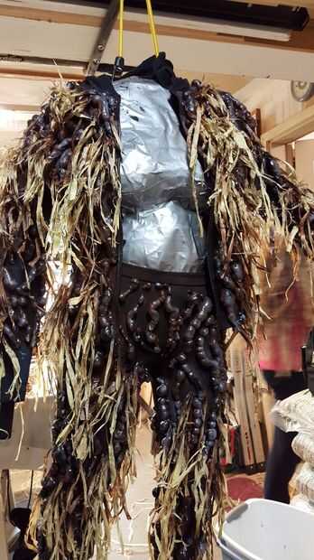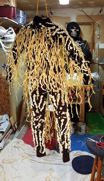 Este paso consiste en dos partes, látex líquido y rafia. Hemos utilizado algunos restos látex líquido negro del último proyecto de años, RD 407 máscara fabricación de látex que recibí de www.monstermakers.com. La rafia proviene de una falda de mesa de rafia Natural, 28 en x 9 ft - Party City. Látex caro, rafia barato.