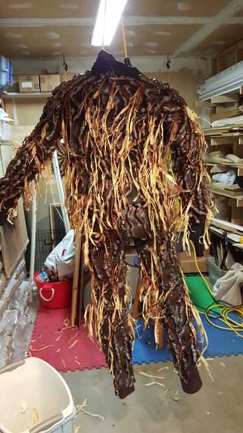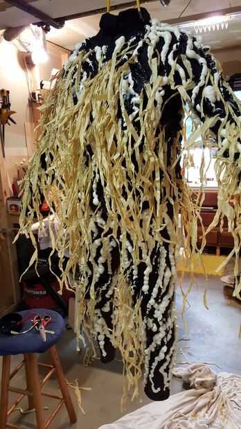 Utilizamos el látex a cubierta donde la espuma se encuentra con la prenda subyacente. Esto creó un medio maravillosamente flexible de mantener ese frágil espuma en lugar. El látex es también un excelente pegamento que queda flexible. Como aplica el látex, presionamos en tiras de rafia para dar este heno como aspecto.