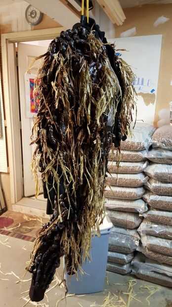 Luego pintan. Supongo que probablemente podría hacerlo con latas de pintura pero prefiero a aerógrafo. Empecé con marrón y luego utiliza negro para oscurecer áreas y romper cualquier patrón en el cuerpo. Los dos colores también hacen la rafia ser viejo y podrido, que es ideal.
