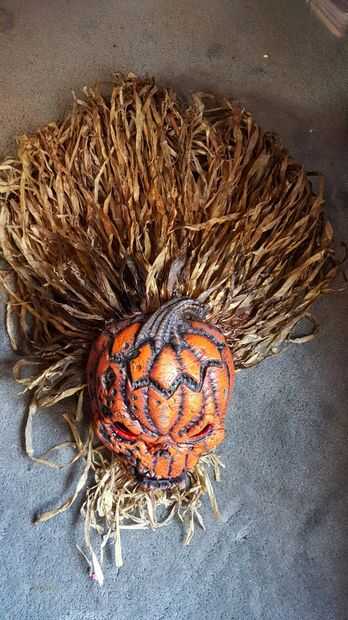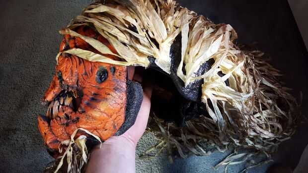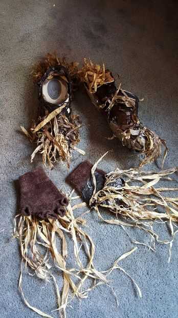Pies y manos fueron logradas usando los mismos métodos señalados. Mi esposa recogió algunos viejos zapatos y guantes que cubrimos con látex y rafia para que coincida con el traje.