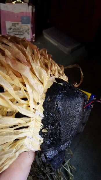Agregar la rafia era demasiado simple. Capas de látex negro el casco justo detrás de la máscara y luego prensado en una tira de rafia.