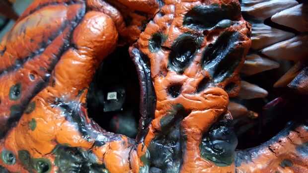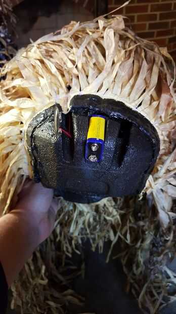Para los ojos, tomé algunos brillantes rojo led automotrices tiras de la luz, el tipo se puede cortar en trozos. Hay docenas de maneras de crear ojos iluminados así que ven esto en Instructables para decidir cómo desea hacerlo usted mismo. Para mí, acabo de soldar unos cables a la tira de Led y conecta a una batería de 9 voltios. Ajuste la batería en una de las aberturas en el casco de espuma. Las luces eran fáciles de colocar con cinta un poco y luego la cubrí con el látex negro que le mantenga todo en su lugar. Unos vínculos punto a través de algunos orificios aseguran que no se moverá.