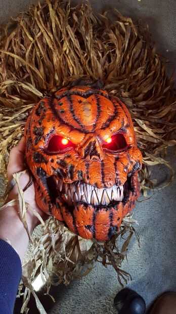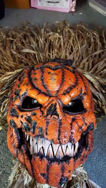 Esto fue bastante fácil. En vez de sólo usar la máscara, tomamos un viejo casco de la bicicleta y usa unos lazos punto para fijar la máscara en el casco de espuma negra. Porque el casco es más largo que el cráneo de mi esposa, dan la cabeza una forma larga agradable para trabajar con.