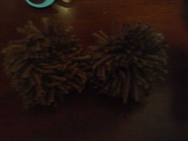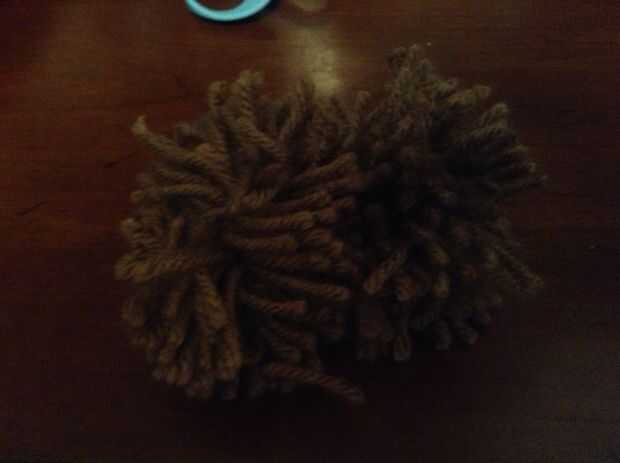 Para este paso caliente del pompón de la cola los dos juntos. Si usted quiere, cepille el hilo para que sea esponjosa.