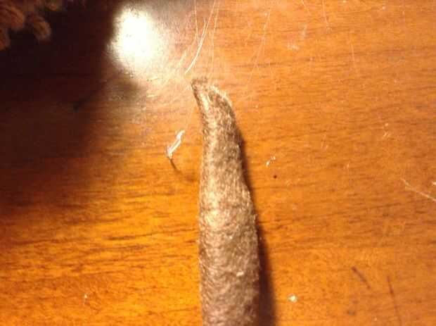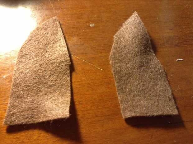 Cuernos de la bestia son un poco complicados. Cortar dos triángulos de fieltro largo, marrón, opacos. Un lado pegamento caliente hacia abajo. Luego doblar por la mitad y pegar en esa posición. Finalmente sujete a la cabeza entre las orejas.