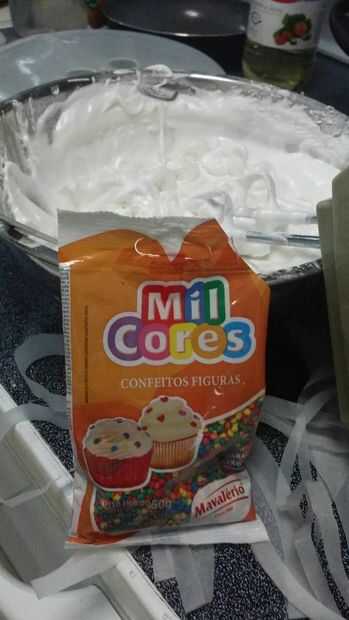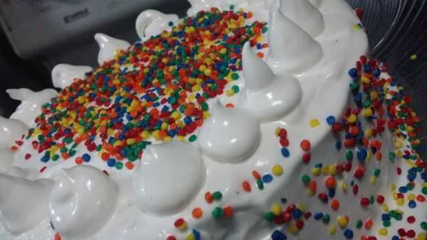 Una vez que tenga la torta cubierta con lo que te gusta helar. Usé 3 claras de huevo y 1 bolsa de polvo de azúcar con un chorrito de limón. Y salpicaduras.