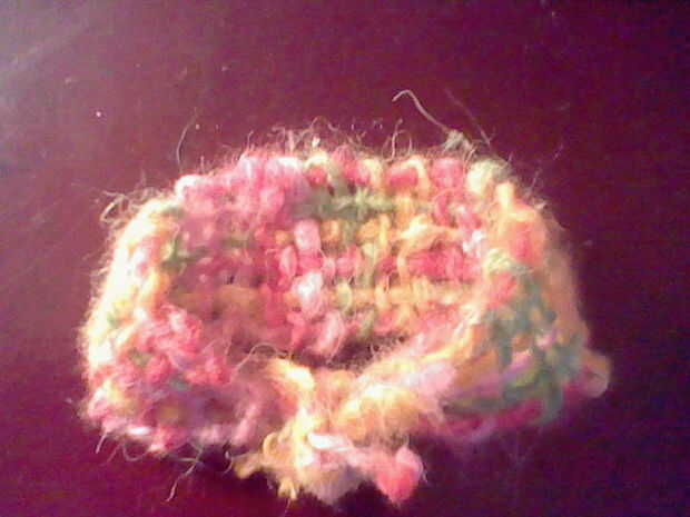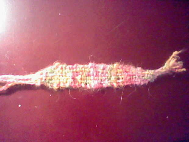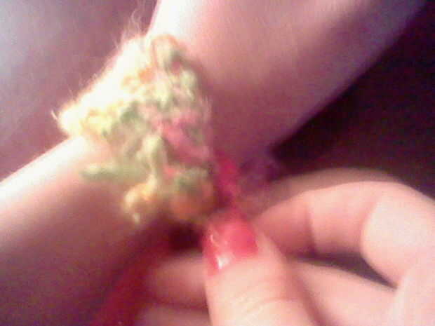 Ajuste al tamaño de la muñeca cortando por la mitad el el gran nudo en la parte posterior de la pieza tejida. Recuerda no cortar el área de tejido. Luego envolver pulsera alrededor de la muñeca y un nudo triple suelta bastante así que usted podría pegar dos dedos entre la muñeca y la pulsera. Terminado!