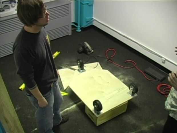 Corte el punto posterior. Cuadrados y coloque las ruedas hacia abajo. Las dos ruedas fijas deben ir en las esquinas delanteras y la rueda giratoria en la parte posterior.