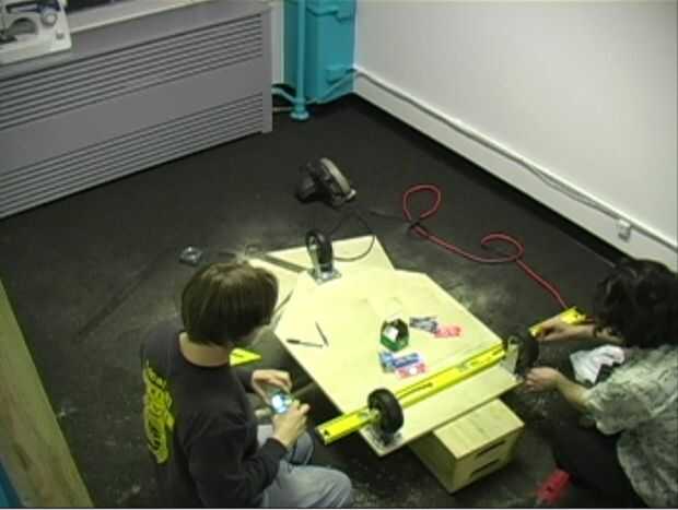 Coloque las ruedas en la cubierta de madera y la línea encima de las placas.
